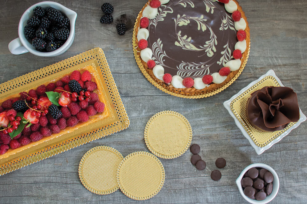They combine a rigid cake board center with a decorative doily edge. These boards are made of solid cardboard, laminated with a grease resistant high gloss gold finish impermeable to oils and moisture. The center area of the doily has an anti-slip embossing to reduce the risk of product movement during handling. These doilies make a beautiful presentation for: cakes, bûche de noël, roulades and tarts. Custom embossing is available.