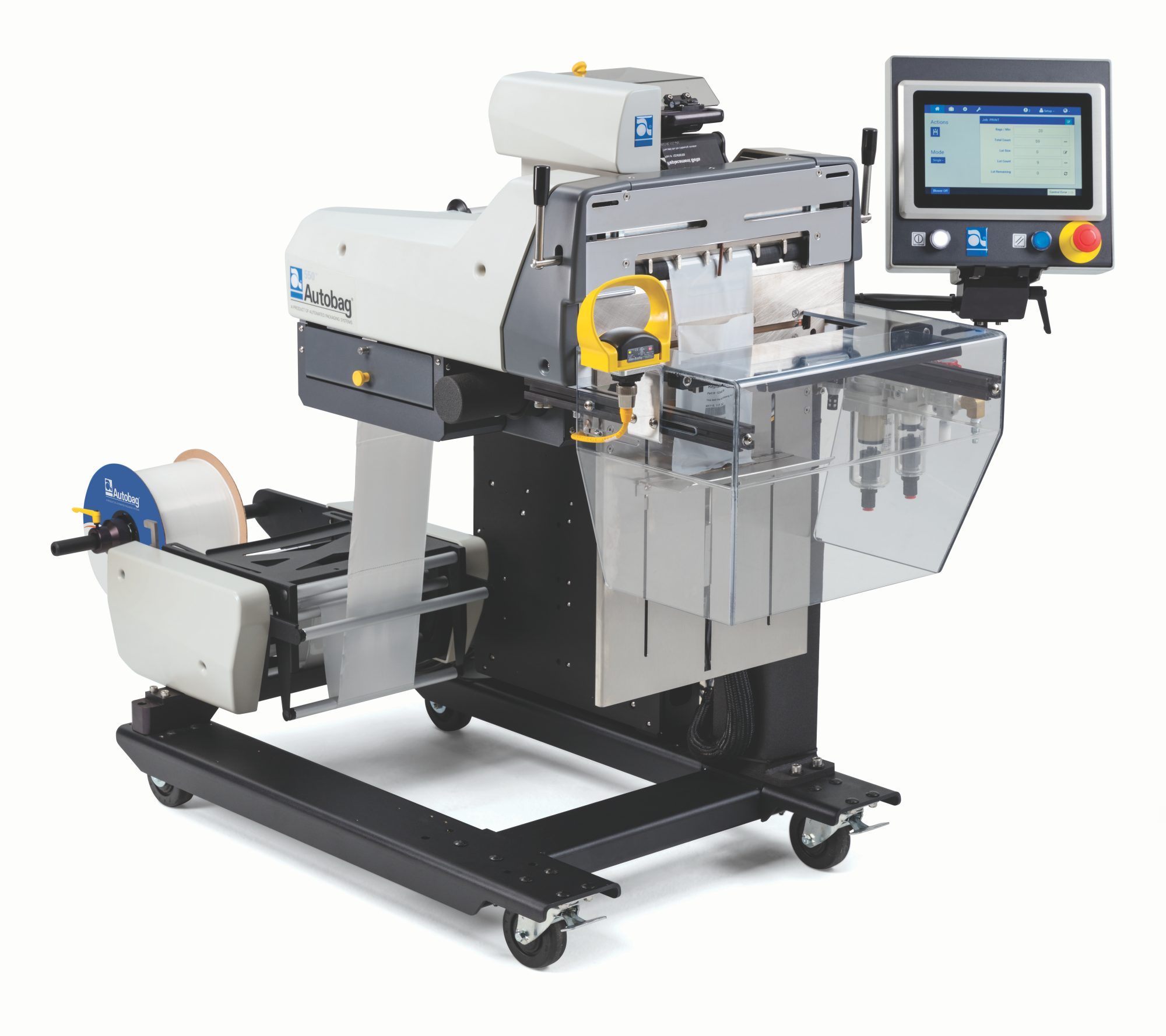 | Configuration operating at speeds up to 45 bags per minute (BPM). These high-speed bagging system is designed for reliability, flexibility, and optimizing packaging throughput. The AUTOBAG® 550 includes many of the same conveniences of the standard AUTOBAG® 500 with the addition of a thermal transfer printer. This provides next-bag-out printing technology that is ideal for short run, order fulfillment and ecommerce applications. High resolution graphics, text and bar codes can be printed on the bag, eliminating the need for a separate labeling system. |