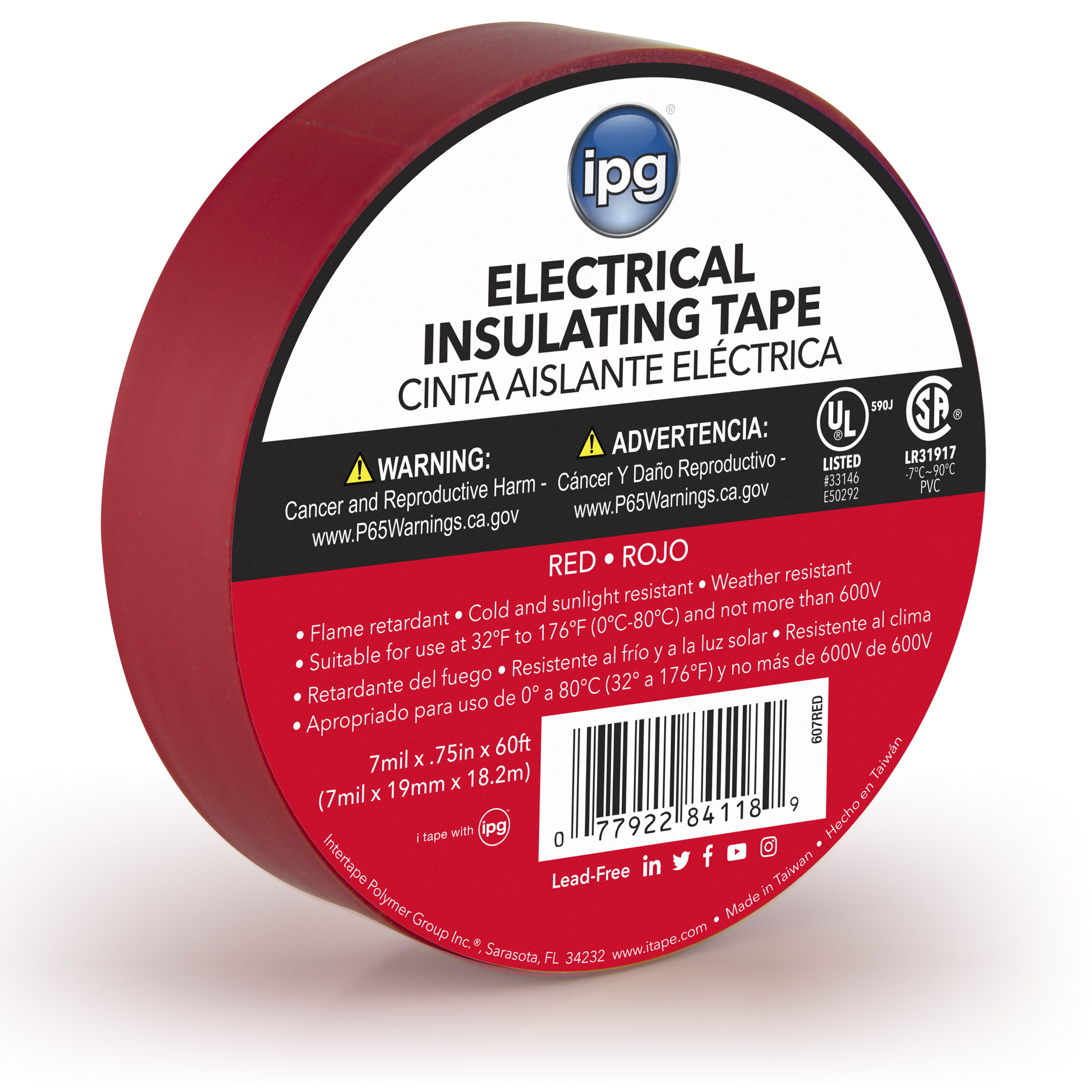 Vinyl electrical insulating tape consisting of a soft ‘plasticized’ stabilized PVC film coated with a non-corrosive rubber based adhesive. This tape is resistant to water, oils, acids, alkalis, and other corrosive chemicals. Lead free, UL and CSA listed.