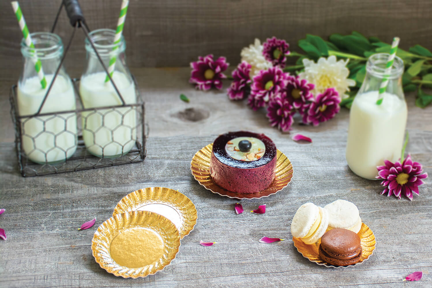 These plates are made of cardboard with a laminated gold finish and fluted along the outer rim. The smaller sizes are perfect for dressing up individual pastries and desserts, while the larger sizes are great for special occasion plates.