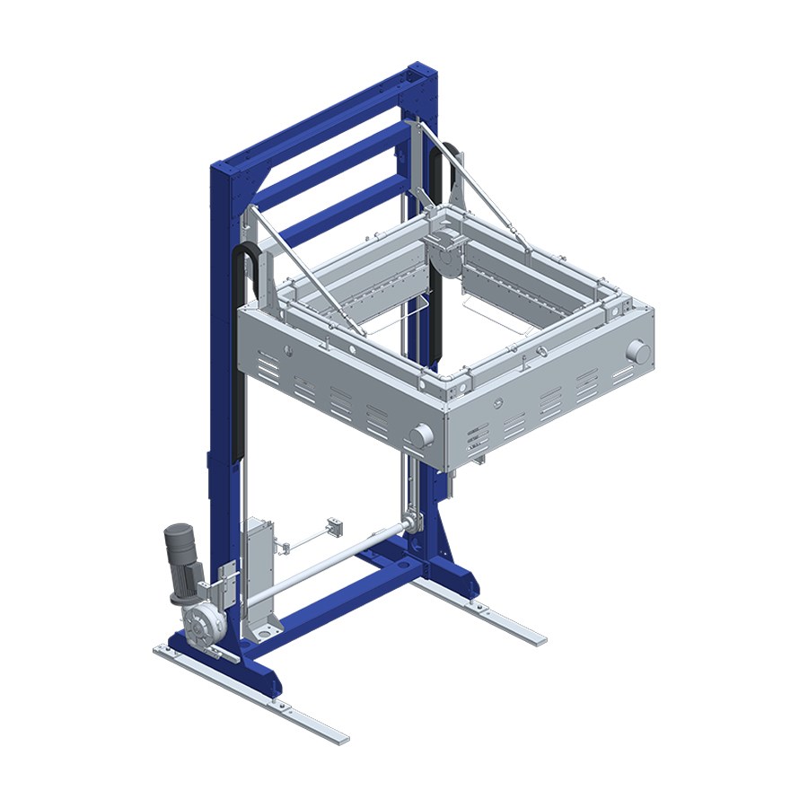 It moves vertically, it is driven by an inverter controlled motor and is supported by four sturdy chains. It also carries the four hot air burners, the gas distribution and regulation for each burner, the electrical parts which control gas lighting and the flame control.