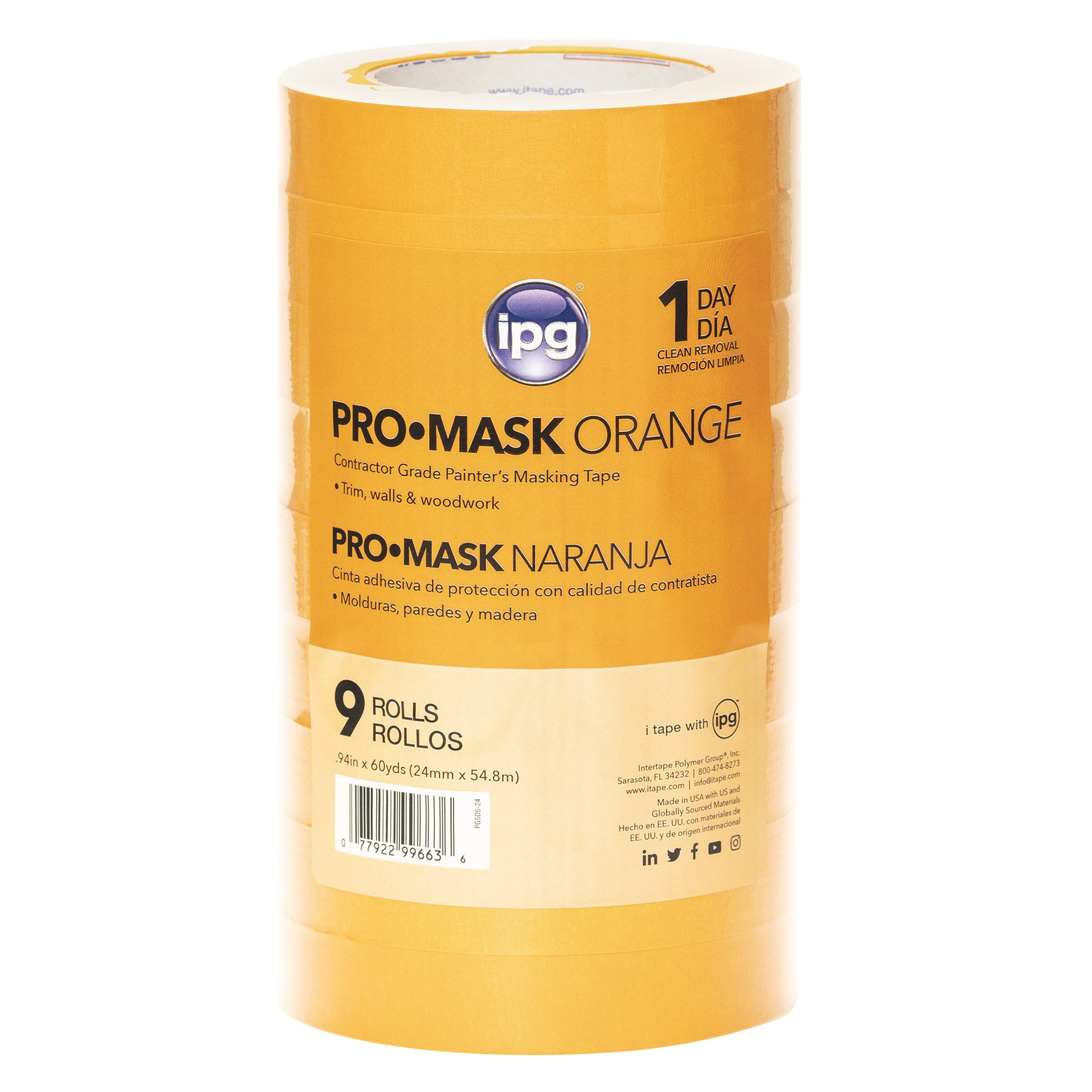 PG505 ProMask Orange is a Contractor Grade crepe paper masking tape with a pressure-sensitive natural rubber based adhesive. Recommended for most paint masking applications where excellent conformability and clean removal are desired.