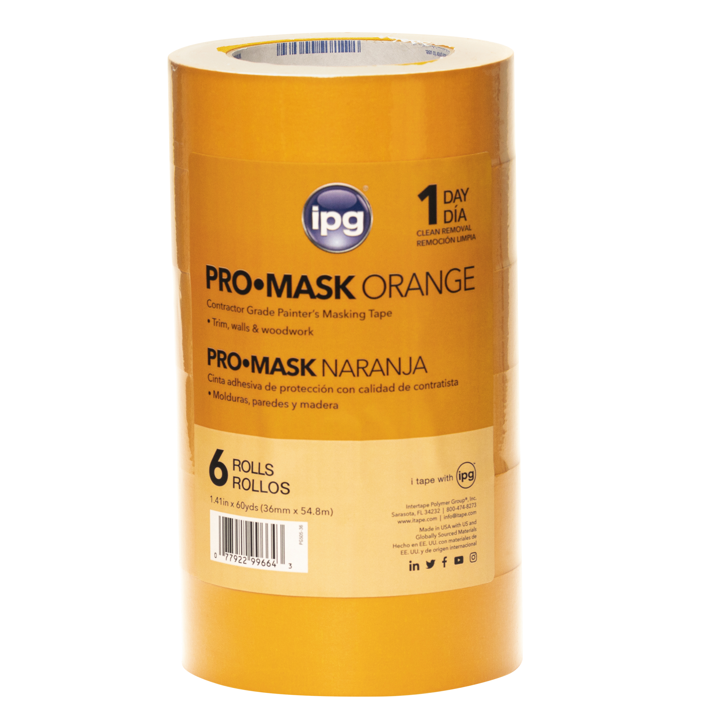 PG505 ProMask Orange is a Contractor Grade crepe paper masking tape with a pressure-sensitive natural rubber based adhesive. Recommended for most paint masking applications where excellent conformability and clean removal are desired.